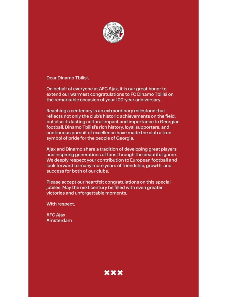 „აიაქსმა“ კი „დინამოს“ იუბილე ოფიციალურად მიულოცა და წერილი მოსწერა: