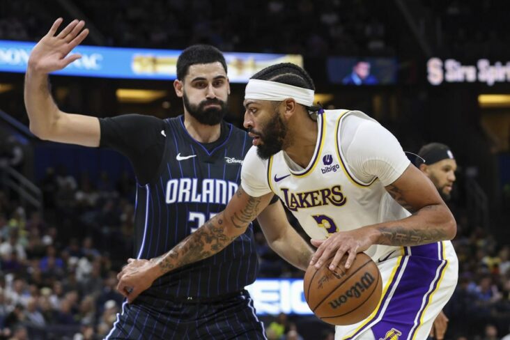 Los Angeles Lakers forward Anthony Davis (3) drives while defended by Orlando Magic center Goga Bitadze (35) during the first half of an NBA basketball game Saturday, Nov. 4, 2023, in Orlando, Fla. (AP Photo/Gary McCullough)