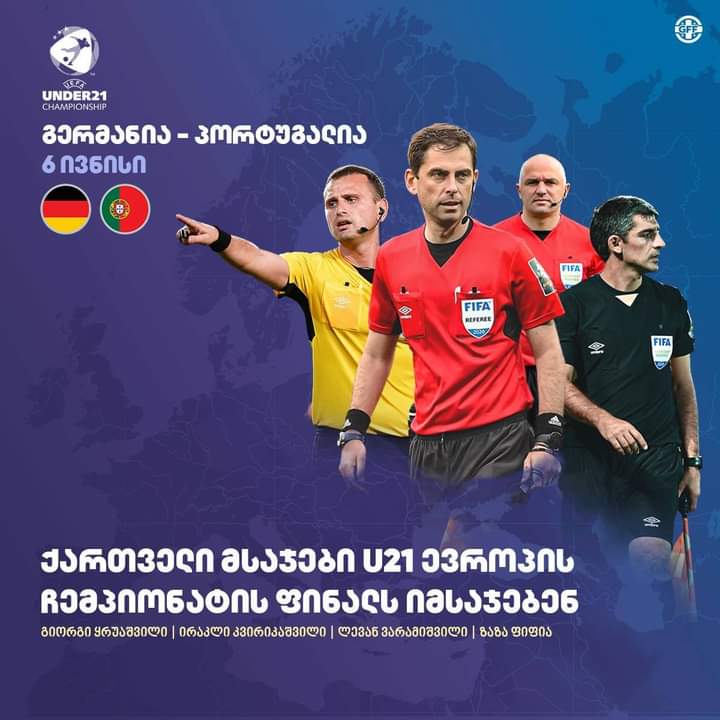 6 ივნისს, სლოვენიის დედაქალაქ ლუბლიანაში, 2021 წლის 21-წლამდე ფეხბურთელთა ევროპის ჩემპიონატის ფინალში ერთმანეთს გერმანიისა და პორტუგალიის ნაკრებები დაუპირისპირდებიან. უეფას გადაწყვეტილებით, ისტორიაში პირველად, კონტინენტის პირველობის გადამწყვეტ შეხვედრას ქართველი მსაჯები განსჯიან. მთავარი არბიტრი გიორგი ყრუაშვილი იქნება, მას ასისტენტობას ლევან ვარამიშვილი და ზაზა ფიფია გაუწევენ, მეოთხე მსაჯი კი, ირაკლი კვირიკაშვილია.