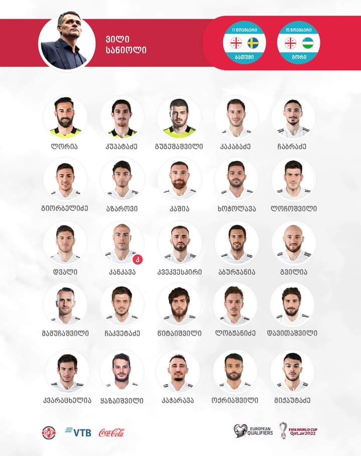 ვილი სანიოლმა უახლოესი მატჩებისთვის ეროვნულ ნაკრებში 25 ფეხბურთელი გამოიძახა. მათ შორის ერთი დებიუტანტია – გორის “დილას” 22 წლის მეკარე ლუკა გუგეშაშვილი.