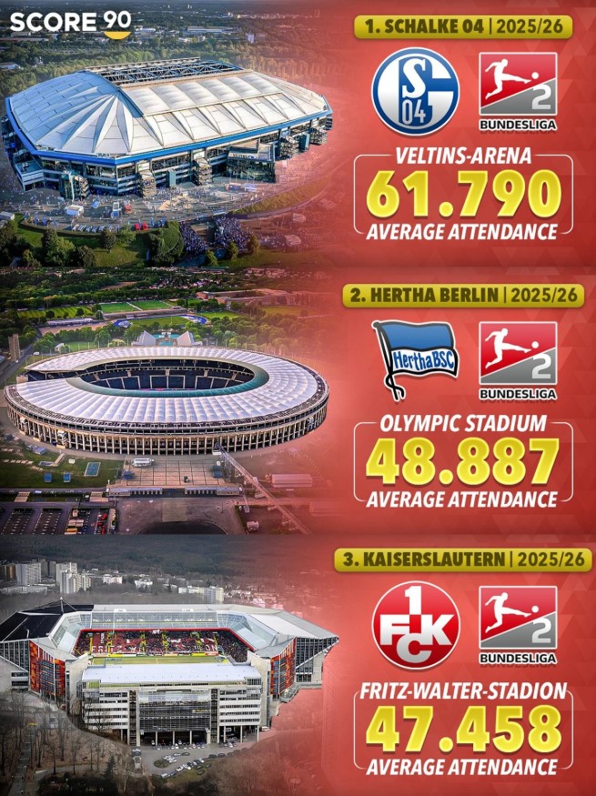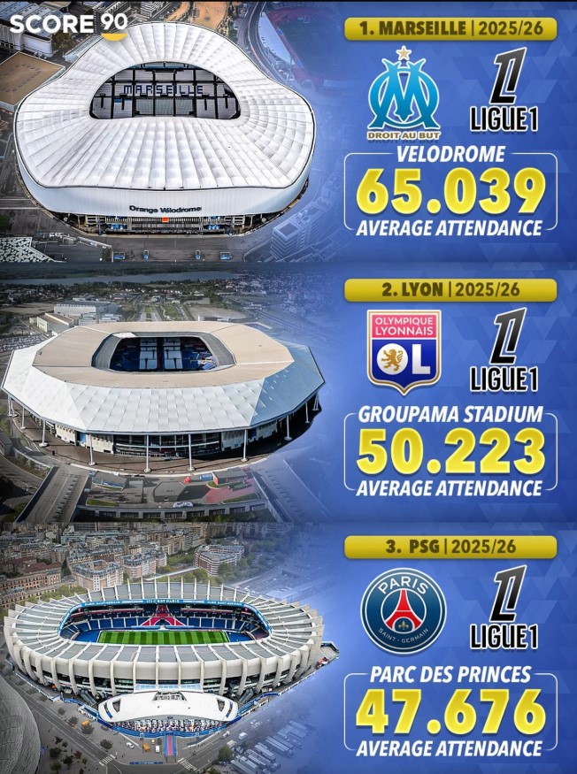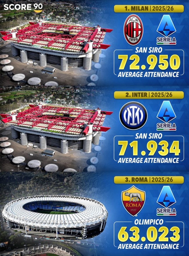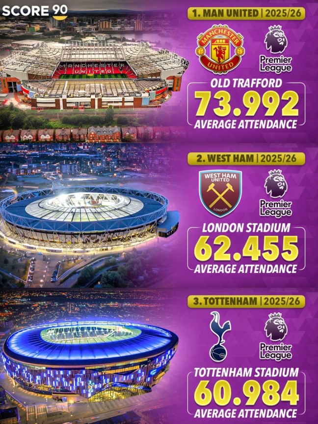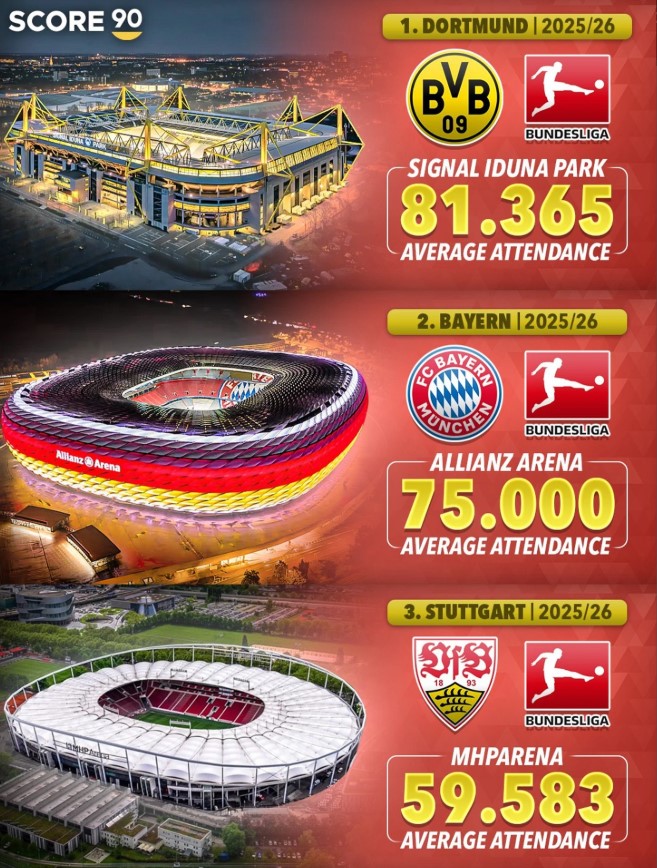 Score90 პორტალმა ევროპის ხუთი საუკეთესო ლიგიდან თითოეულში სამი ყველაზე დასწრებადი სტადიონი დაასახელა. რეიტინგი 2025/26 წლების სეზონის სტადიონების საშუალო დასწრების მაჩვენებელს ეფუძნება.