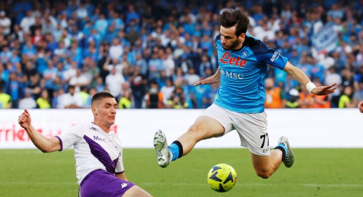 FILE PHOTO: Soccer Football - Serie A - Napoli v Fiorentina - Stadio Diego Armando Maradona, Naples, Italy - May 7, 2023 Napoli's Khvicha Kvaratskhelia in action Fiorentina's Nikola Milenkovic REUTERS/Ciro De Luca/File Photo