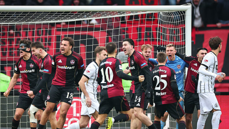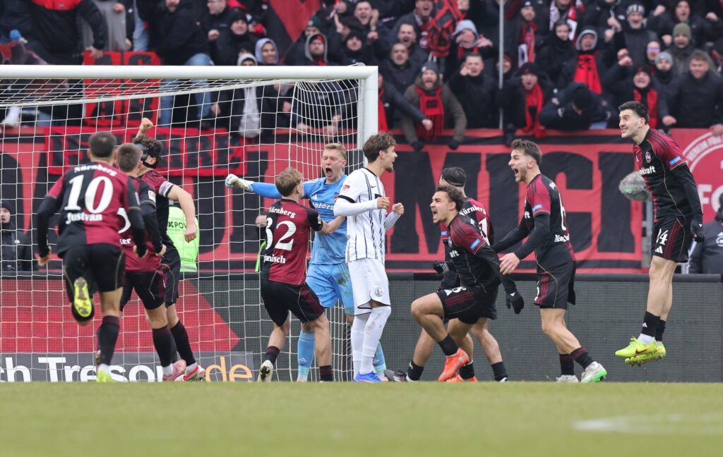 17.01.2026, Bayern, Nürnberg: Fußball: 2. Bundesliga, 1. FC Nürnberg - SV Elversberg, 18. Spieltag im Max-Morlock-Stadion. Torwart Jan Reichert (3.v.r, 1. FC Nürnberg) jubelt mit den Teamkollegen nachdem er den Strafstoß von Otto Stange (r, SV 07 Elversberg) gehalten hat. Foto: Daniel Karmann/dpa - WICHTIGER HINWEIS: Gemäß den Vorgaben der DFL Deutsche Fußball Liga bzw. des DFB Deutscher Fußball-Bund ist es untersagt, in dem Stadion und/oder vom Spiel angefertigte Fotoaufnahmen in Form von Sequenzbildern und/oder videoähnlichen Fotostrecken zu verwerten bzw. verwerten zu lassen. +++ dpa-Bildfunk +++