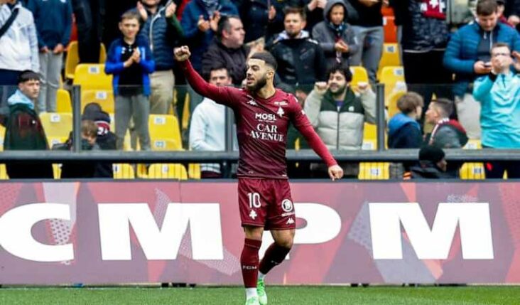 George MIKAUTADZE of Metz celebrates his goal during the Ligue 1 Uber Eats match between Metz and Lille at Stade Saint-Symphorien on April 28, 2024 in Metz, France. (Photo by Loic Baratoux/FEP/Icon Sport) - Photo by Icon Sport