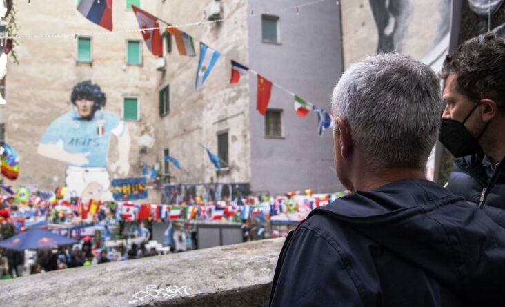 მოურინიო ნეაპოლში მარადონას ფრესკასთან მივიდა და ყვავილები მიიტანა