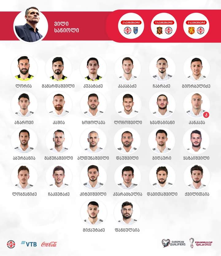 უახლოესი სამი მატჩისთვის ვილი სანიოლმა 26 ფეხბურთელი გამოიძახა. მათ შორის ხუთი დებიუტანტი, რომელთაგან ოთხი საქართველოს კრისტალბეთ ეროვნულ ლიგას წარმოადგენს.
